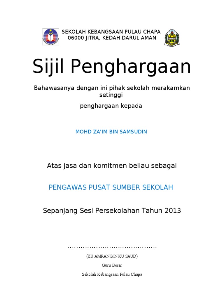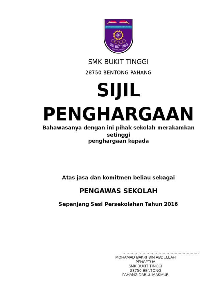 Contoh Sijil Penghargaan Pengawas Sekolah