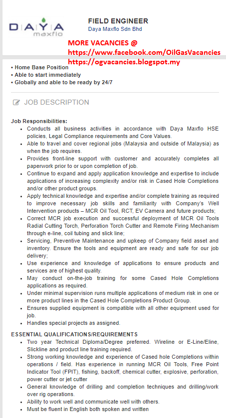 Oil Gas Vacancies Field Engineer Daya Maxflo Malaysia