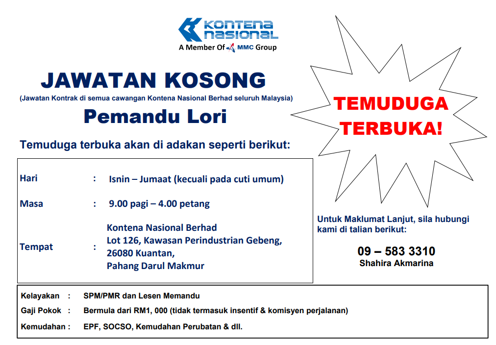 Jawatan Kosong Driver Lori Kontena Nasional