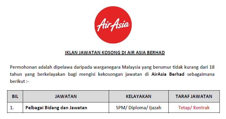 Jawatan Kosong Di Airasia Berhad Tetap Kontrak Ejawatankini Com