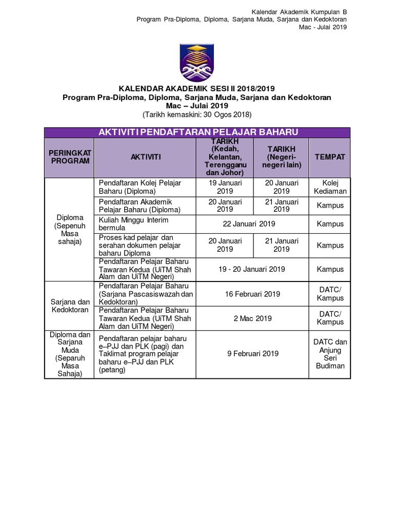 Uitm Official On Twitter Kalendar Akademik Sesi Ii 2018 2019 Program Pra Diploma Diploma Sarjana Muda Sarjana Dan Kedoktoran Mac Julai 2019 Https T Co Kfhotxrrjm Uitmdihatiku Https T Co Jaoum5xc85