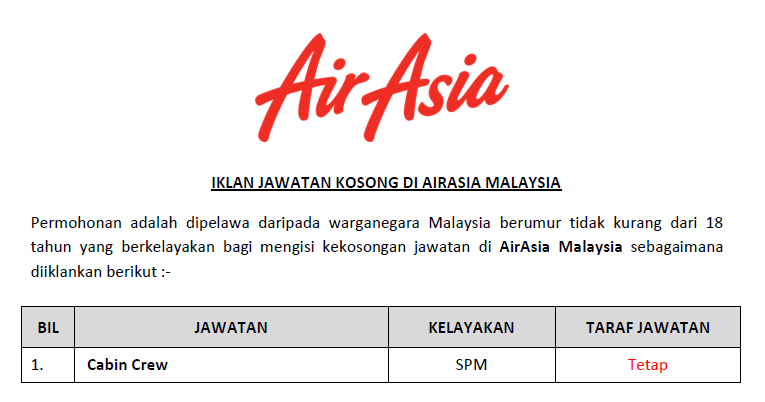 Temuduga Terbuka Cabin Crew Airasia Berhad 13 27 Januari 2018 Jawatan Kosong Kerajaan Swasta Terkini Malaysia 2020 2021