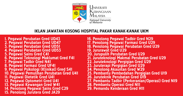 May 29 2020 kerajaan. Pegawai perubatan ud47 2. Jawatan kosong 2020 di universiti kebangsaan malaysia ukm permohonan adalah dipelawa daripada warganegara malaysia yang berkelayakan dan berumur tidak kurang dari 18 tahun pada tarikh tutup iklan ditawarkan untuk memohon jawatan kosong terkini di universiti kebangsaan malaysia ukm. Senarai mengikut negeri johor kedah kelantan melaka negeri sembilan pahang perak perlis pulau pinang sabah sarawak selangor terengganu.