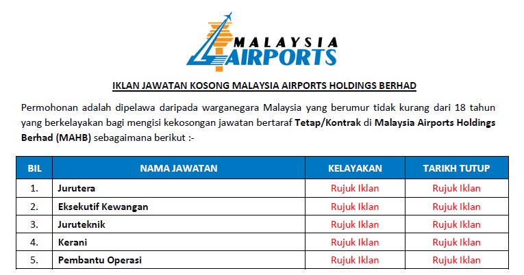 Malaysia Airport Holdings Berhad Mahb Jawatan Baru Dibuka Jobcari Com Jawatan Kosong Terkini