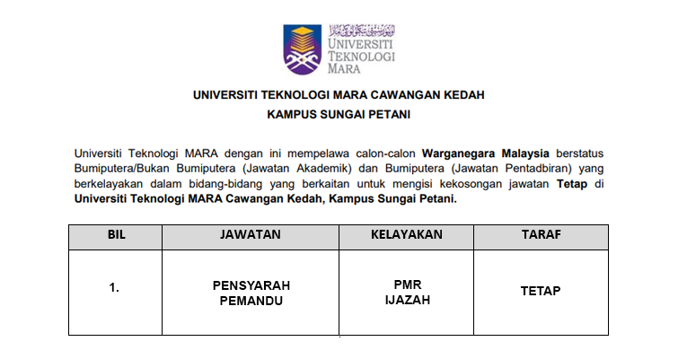 Jawatan Kosong Di Universiti Teknologi Mara Cawangan Kedah