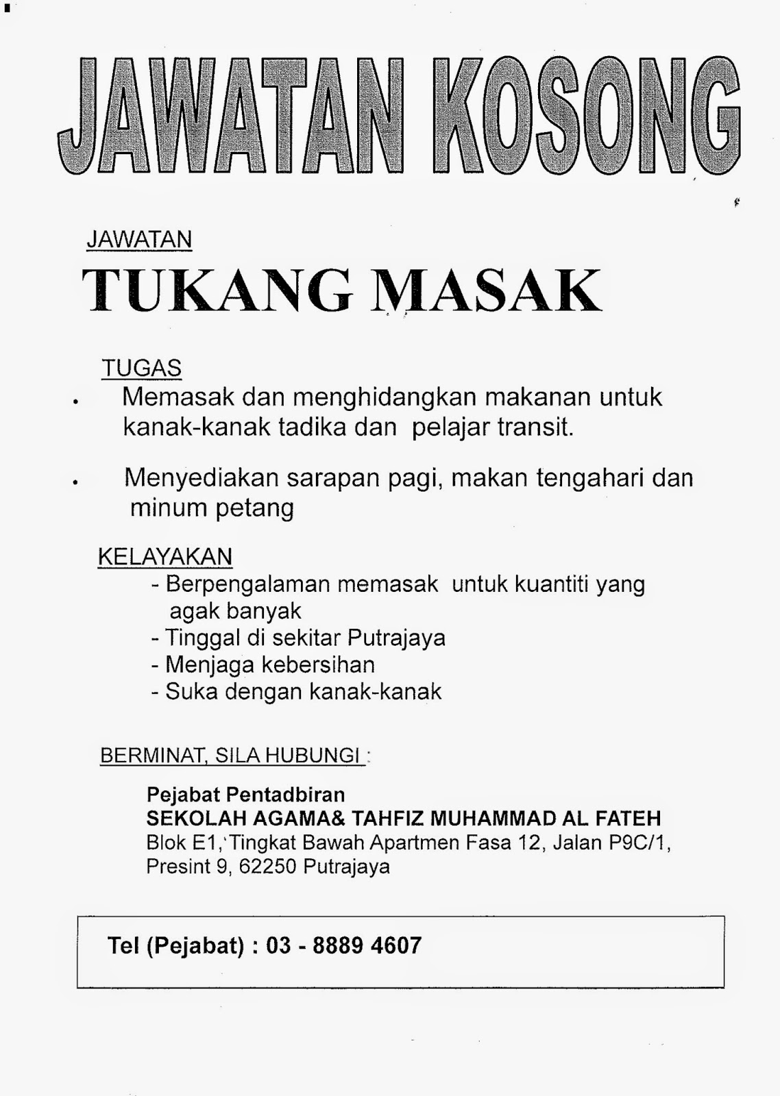 Jawatan Kosong Tukang Masak Guru Pra Maahad Tahfiz Sirajul Quran Facebook