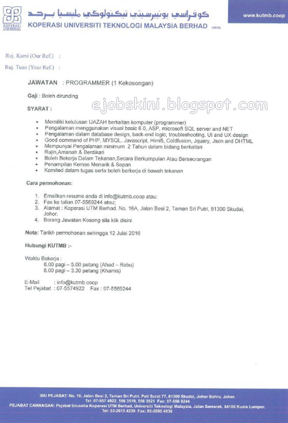 Jawatan Kosong Koperasi Utm Berhad 12 Julai 2016