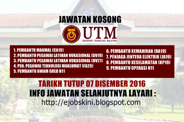 Jawatan Kosong Universiti Teknologi Malaysia Utm 07 Disember 2016