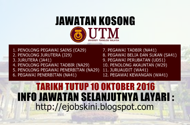 Jawatan Kosong Universiti Teknologi Malaysia Utm 10 Oktober 2016