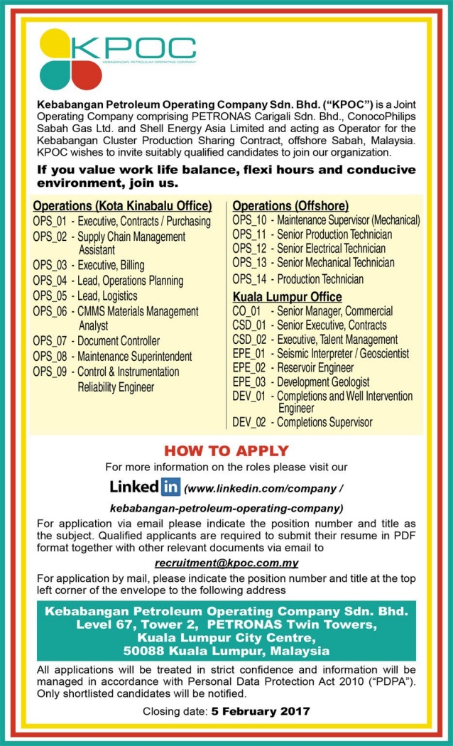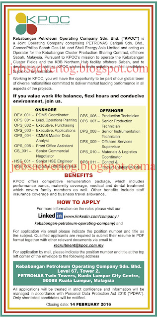 Oil Gas Vacancies Kebabangan Petroleum Operating Company Sdn Bhd Kpoc Kota Kinabalu Offshore Kuala Lumpur