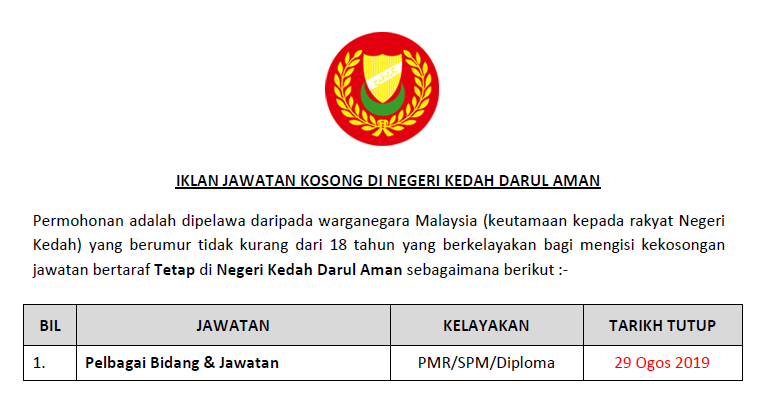 Jawatan Kosong Di Negeri Kedah 2019 Kemasukan Segera Jobcari Com Jawatan Kosong Terkini