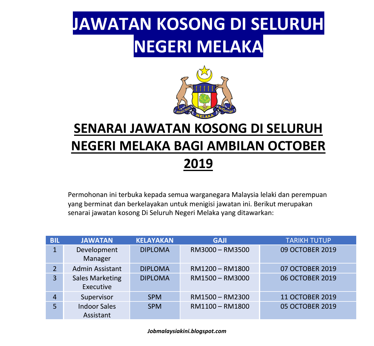 Makluman Jawatan Kosong Di Seluruh Negeri Melaka Ambilan October 2019 Jobmalaysiankini Com