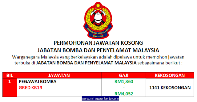 1141 Kekosongan Jawatan Pegawai Bomba Gred Kb19 Ditawarkan Di Jabatan Bomba Dan Penyelamat Malaysia Sehingga 08 Disember 2019 Mingguan Kerja