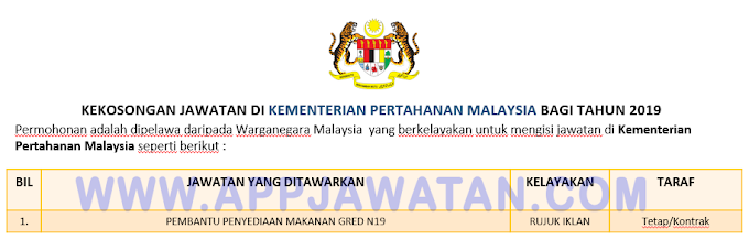 Iklan Kekosongan Jawatan Pembantu Penyediaan Makanan Gred N19 Secara Kontrak Di Kementerian Pertahanan