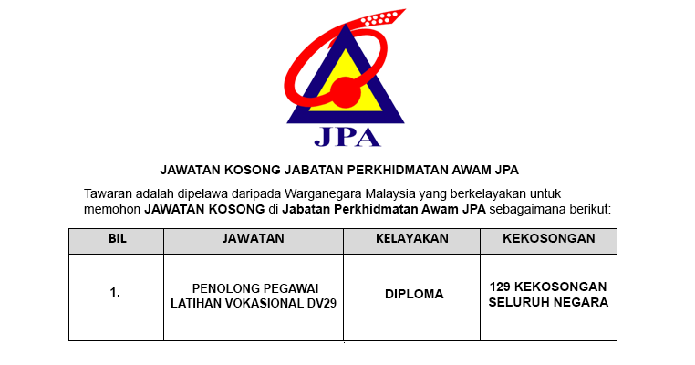 Jawatan Kosong Di Jabatan Perkhidmatan Awam Jpa Penolong Pegawai Latihan Vokasional Dv29 Jobcari Com Jawatan Kosong Terkini