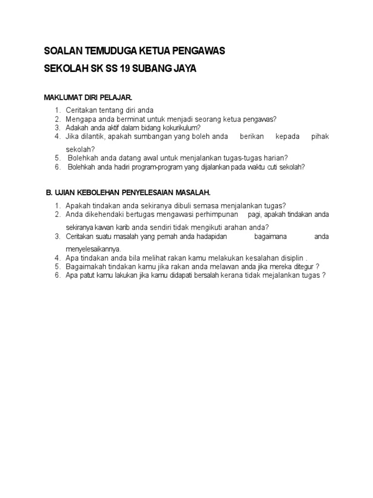 Soalan Dan Jawapan Temuduga Pengawas Sekolah Rendah Persoalan S