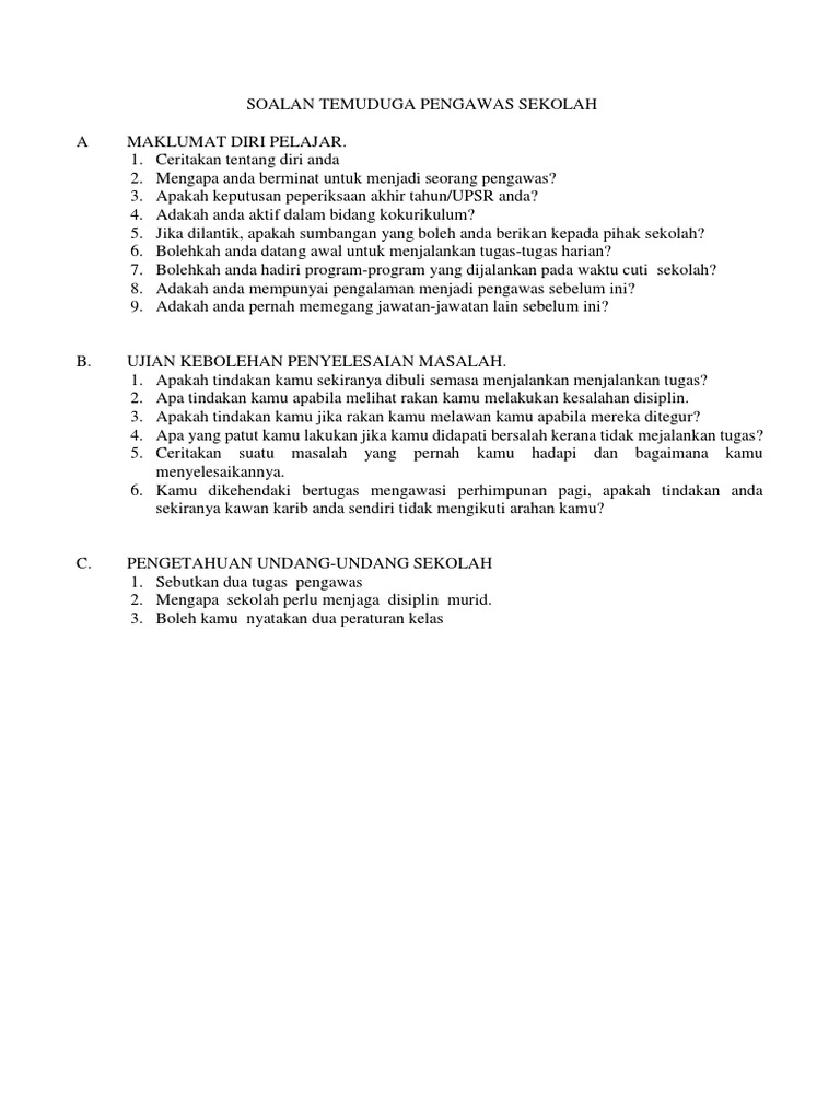 Contoh Soalan Temuduga Pengawas Sekolah Rendah Kuora B