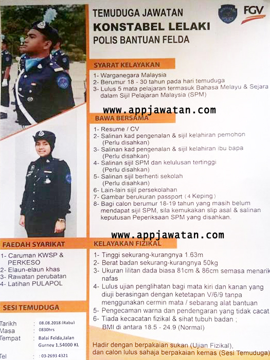 Temuduga Terbuka Konstabel Polis Bantuan Felda 8 Ogos 2018 Appkerja Malaysia