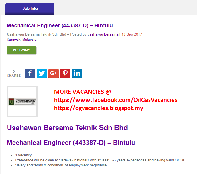 Oil Gas Vacancies Mechanical Engineer Usahawan Bersama Teknik Bintulu